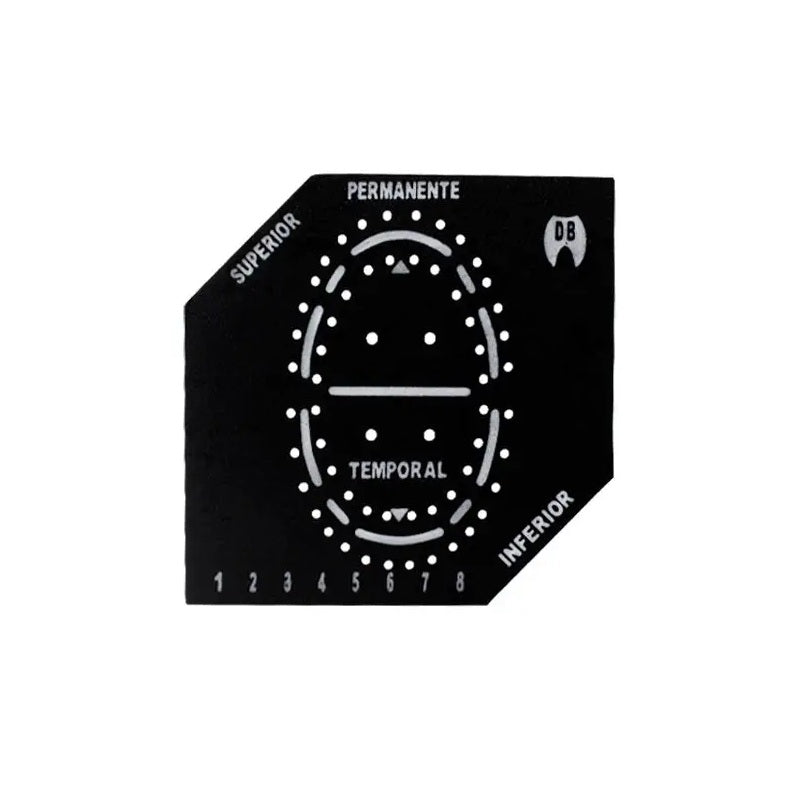 Auxiliar en la colocación y fijación de un dique de goma alrededor de los dientes durante procedimientos dentales. Tiene orificios o ranuras que coinciden con la ubicación de los dientes en la boca y proporciona un marco o guía para que el dentista puedan estirar el dique de goma sobre los dientes de manera uniforme y precisa.