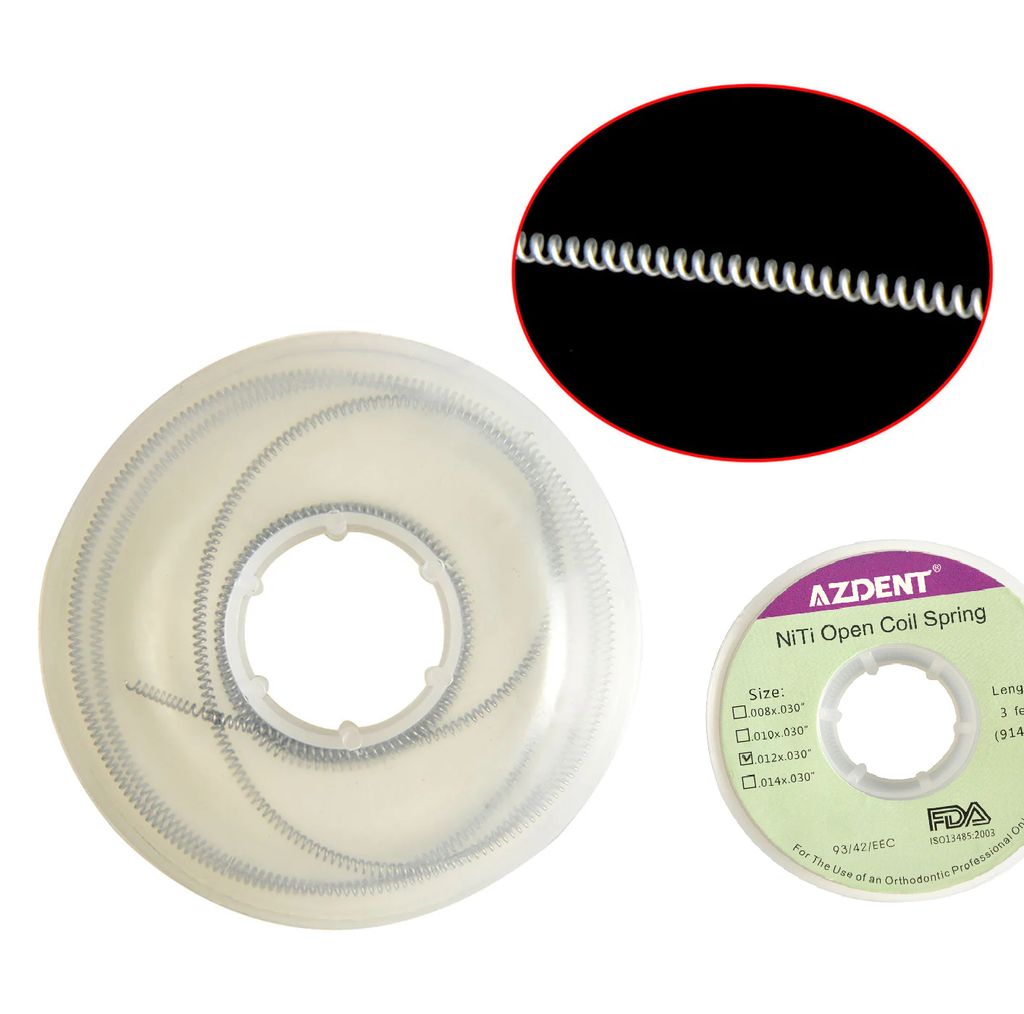Resortes helicoidales abiertos AZDENT Niti de 0,012 x 0,030 pulgadas (1 unidad/rollo). Proporcionan una fuerza continua para abrir o mantener los espacios interdentales.